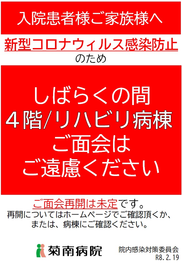 2026.02.19 4階/回復期リハビリ病棟・面会制限のお知らせ 重要なお知らせ 2026年2月19日より 4階/回復期リハビリ病棟 の面会制限を実施いたします。ご迷惑をおかけいたしますが、ご理解ご協力の程、よろしくお願いします。 なお、面会制限の解除についてはホームページにてご案内させていただきます。 ページ送り 一覧へ戻る 前の記事